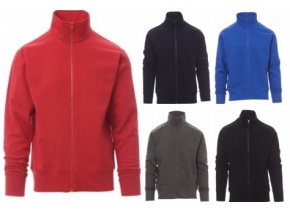 Felpa da uomo, a zip intera in plastica in tinta con cursore singolo in metallo, manica a giro, polsini e vita in costina elasticizzata, cuciture rinforzate, nastro di rinforzo interno collo in tinta.