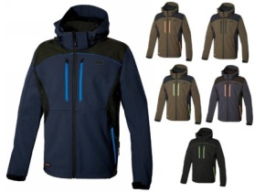 2 ampie tasche petto chiuse con zip, 2 tasche sul fondo con zip, ampio tascone posteriore impermeabile chiuso con zip, apertura centrale con zip, cappuccio regolabile e staccabile, costruzione ergonomica delle maniche, giacca SOFTSHELL con interno in tessuto pile, patta proteggi mento, polsini regolabili con velcro, tasca sul petto porta radio, tessuto bielastico con membrana antivento