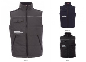 Gilet unisex con zip 8mm, due ampie tasche esterne con zip, ampia tasca al petto multifunzione, porta smartphone e bande riflettenti, anello porta badge; interno: