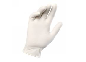 Guanto monouso in lattice di gomma naturale, ambidestro con bordino, a finitura interna ed esterna liscia, lubrificato internamente con polvere vegetale bio-assorbibile.