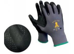 Guanto realizzato in Nylon + Spandex grigio 15 gauge con palmo spalmato in micro-schiuma di nitrile nera. Finitura puntinata sul palmo per una presa extra.