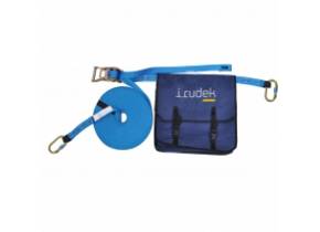 Linea vita temporanea fabbricata con cinghia di poliestere, dotata di un cricchetto che consente di regolare la lunghezza e tendere la cintura facilmente, 2 moschettoni rif. 981. Custodia collegata alla cintura che serve a racchiudere la parte di cintura in eccesso. Lunghezza regolabile in sezioni da 5 a 20 metri.