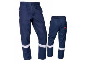 Pantalone con cintura,passanti ed elastico nella parte posteriore, due tasche laterali a soffietto e tasca posteriore destra coperta da aletta fermata con nastro a strappo,tasca portametro sulla gamba posteriore destra chiuso con velcro. tessuto 100% cotone con aggiunta di bande reflettenti