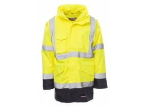 Parka triplo uso bicolore in alta visibilità, composta da: giacca esterna sfoderata, zip intera coperta, cappuccio richiudibile, due tasche frontali con patta, portacellulare e anello di aggancio per porta badge, una tasca interna con velcro. Interno staccabile: giubbino imbottito, maniche staccabili con polsino in RIB elasticizzato, cuciture termonastrate, due tasche frontali con zip, una tasca interna con zip, cuciture termonastrate.