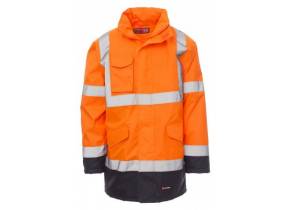 Parka fisso bicolore in alta visibilità con bande riflettenti, zip intera con patta, cappuccio richiudibile nel colletto, polsini in RIB elasticizzato, due tasche frontalicon patta, un portacellulare e anello di aggancio per porta badge. Interno: imbottito, una tasca interna con velcro, cuciture termonastrate.