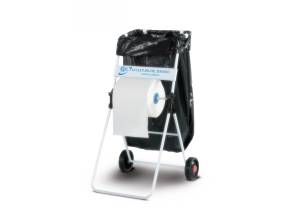 Portarotolo a terra con ruote e porta sacco in tubo metallico smontabile con supporti in plastica a vie per il montaggio. Struttura: tubolare 16 mm verniciato con polvere epossidica. Agganci portasacco in plastica. Sitema di taglio della carta: con lama fissa sempre appoggiata sul rullo.
