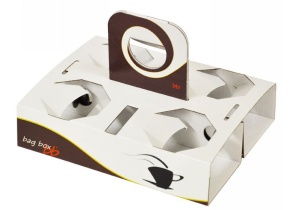 Portabicchieri “BagBox” da 4 posti in cartoncino lucido decorato con manico per facilitarne il trasporto.