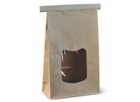 Sacchetto in carta avana laminato in PP con finestra, richiudibile grazie alla striscia metallica.