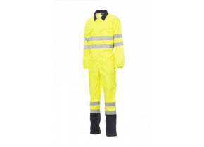 Tuta alta visibilità con bande riflettenti, cerniera centrale coperta a doppio cursore,elastico in vita sul retro. Triple cuciture di rinforzo nel cavallo ed interno gamba.