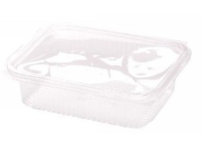 Contenitore rettangolare in PET con coperchio incernierato.